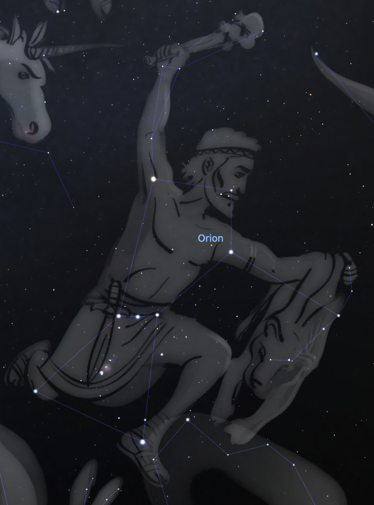 Above: images from the planetarium program Stellarium, showing the constellations referred to in the science story, above.